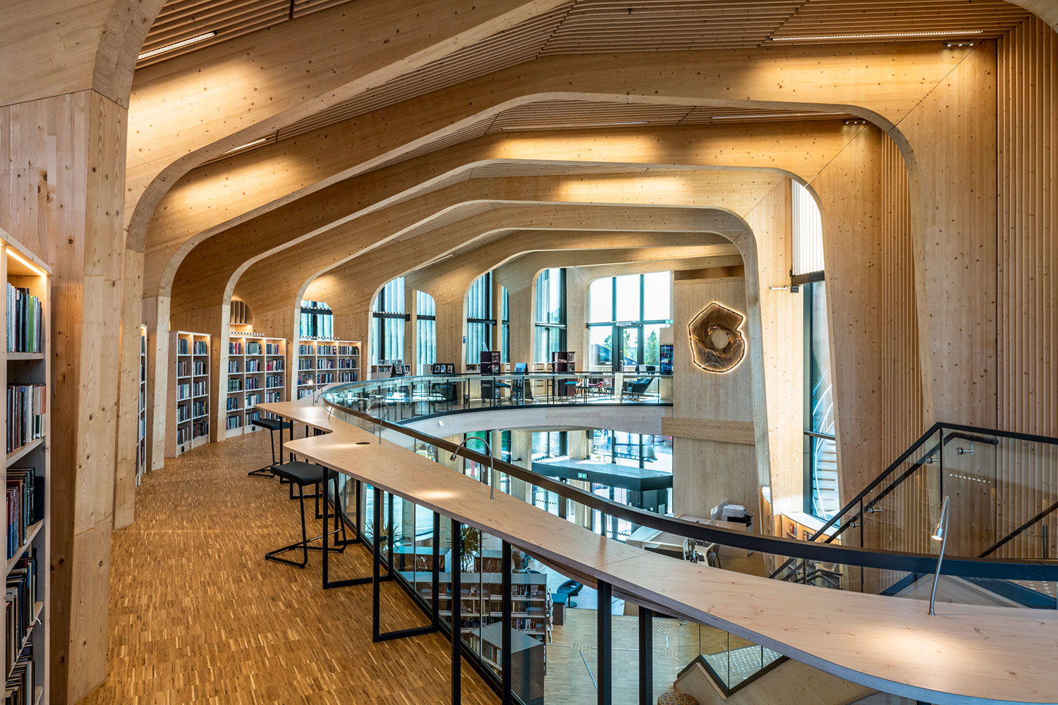 The organically shaped and spectacular building has become a magnet for both literary and architectural enthusiasts. The structure of the building is made of solid wood with an open atrium in the centre.