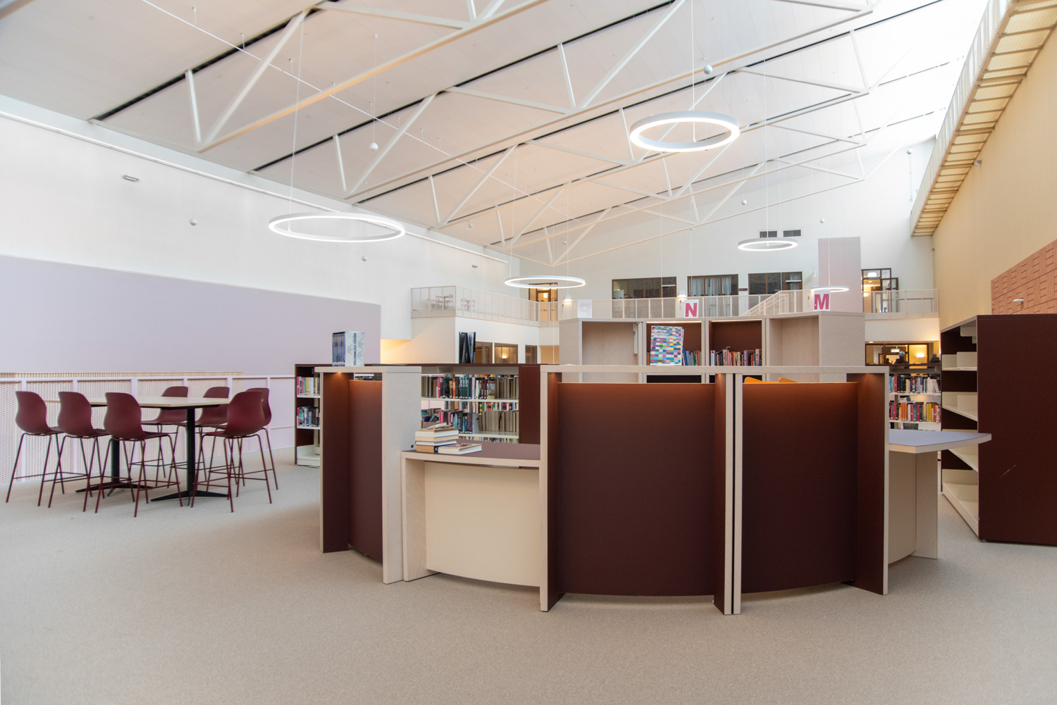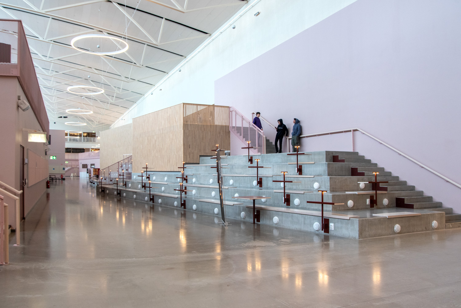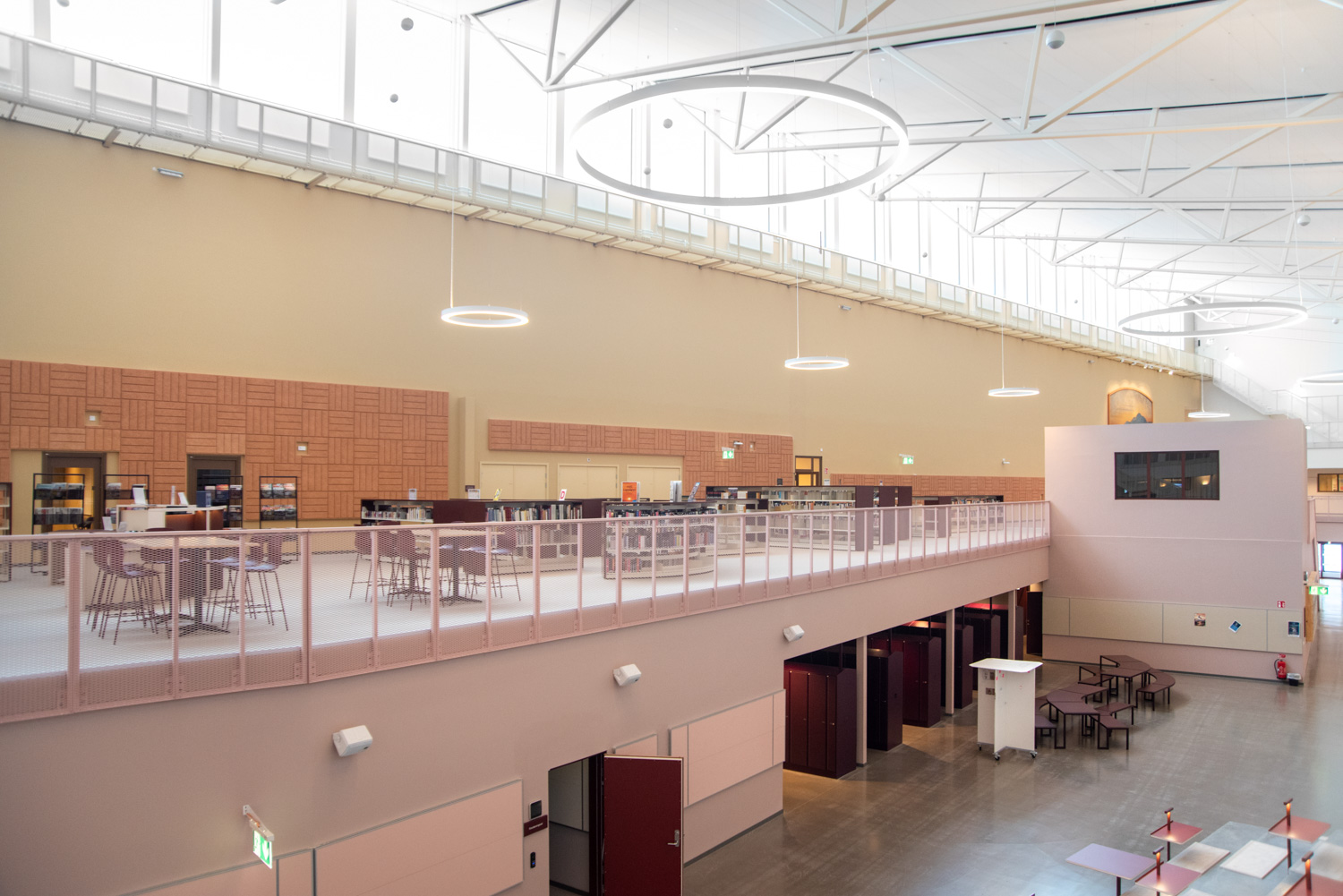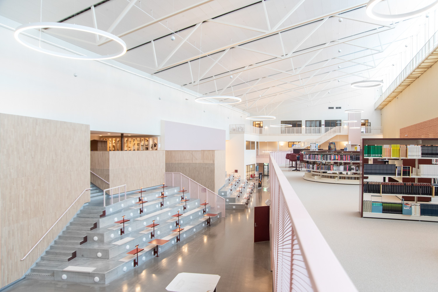 The core of the building is a central square that forms a link between the city of knowledge and the rest of the city centre. From here, the visitor is led into a spacious atrium, where the activities of the city and the school meet in a common and public space. The library is also located here, where a generous amount of daylight comes from large glass sections near the roof, which invite visitors to look up at the sky and follow the different characteristics of the seasons.
