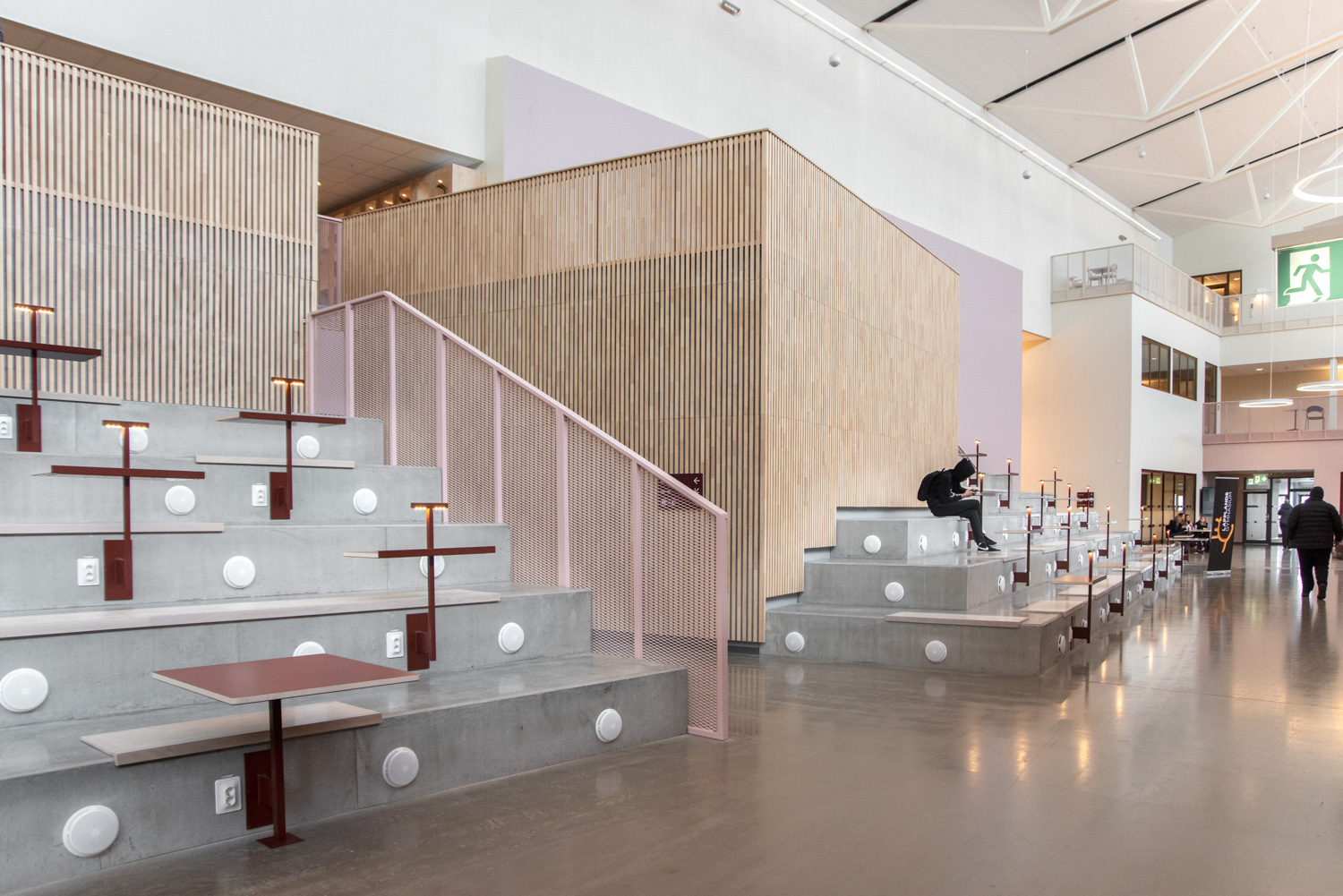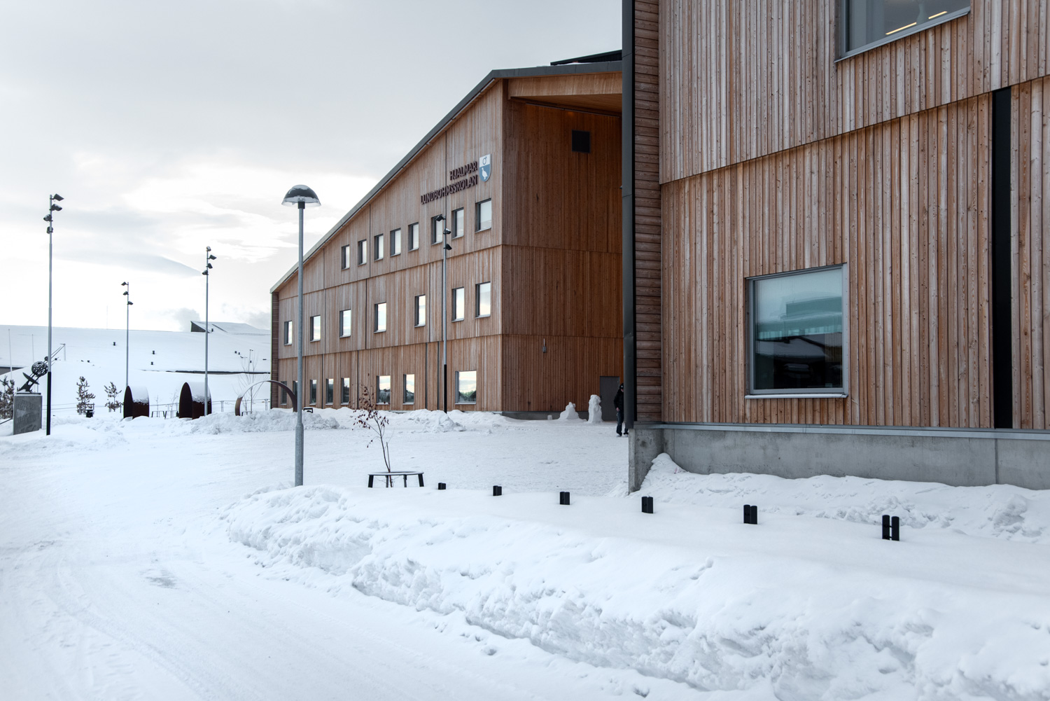 In Kiruna a 40,000 m2 education centre is located in extension of the city park, where several educational facilities work together; a culture school, a high school with theoretical and practical fields of study and a university with adult studies. The building also contains a sports hall, library and exhibition areas as well as a café and restaurant open to the public.