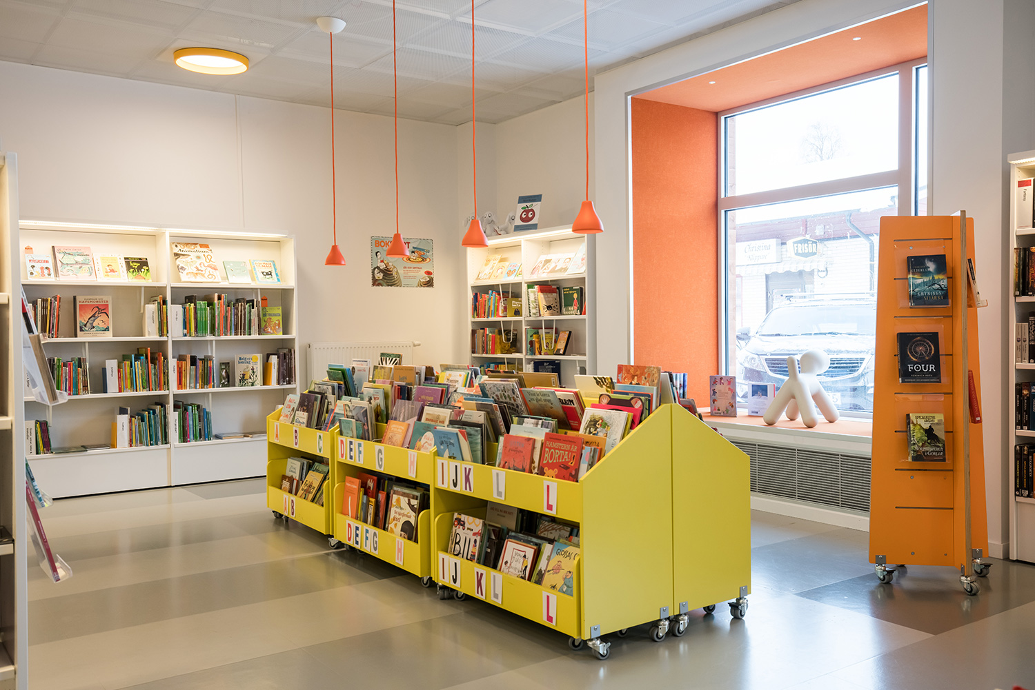 The library is designed in premises that take advantage of the natural light from the large windows. The result is a bright and welcoming environment. All age groups have been taken into consideration with an attractive children's department and several reading and study areas with easy access to library materials on the illuminated shelves.