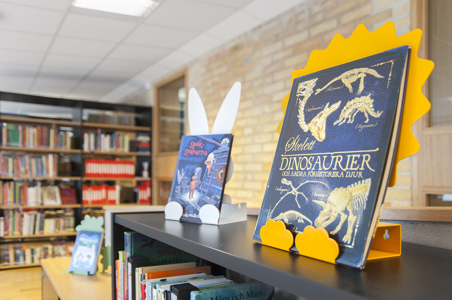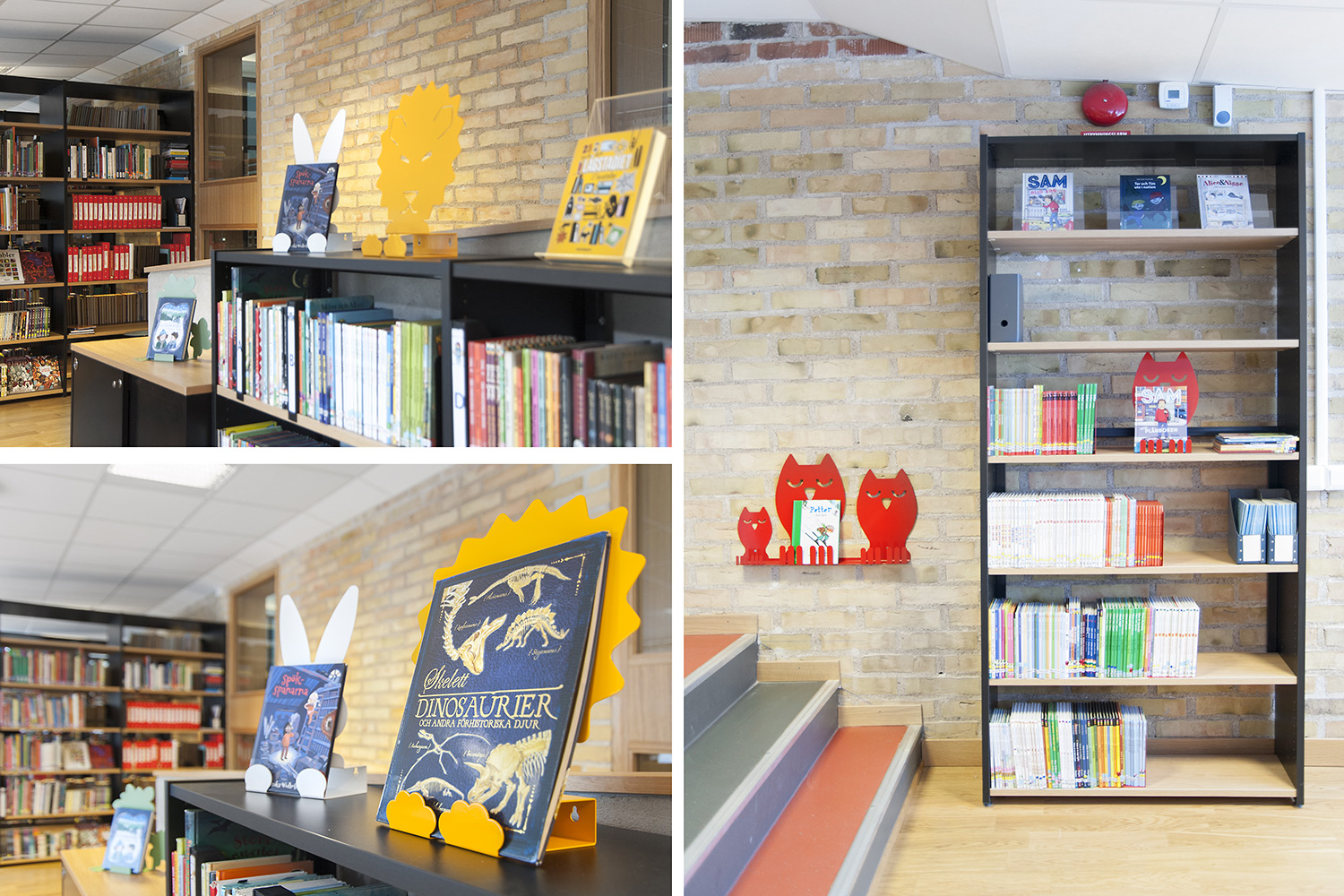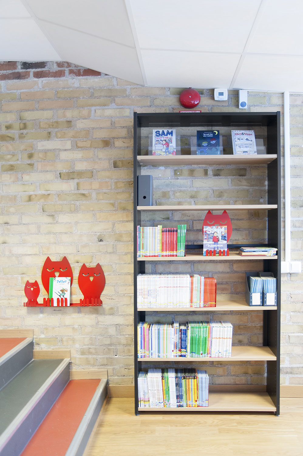 The library especially focuses on displaying and making books and other material easy accessible by using symbol labels to mark book spines. Display stands in an attention-grabbing format such as Owl, Rabbit, Wolf and Lion are used as focal points for books and other media in an inspiring and enjoyable way. Next to the “easy to read” shelving system the owl family sits on the wall showing exciting book titles!