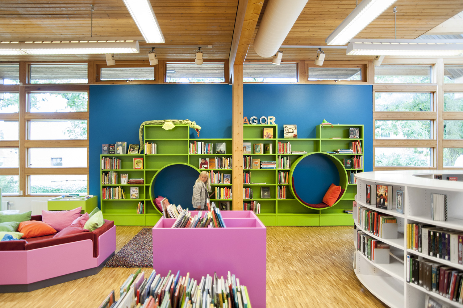 Ystad Public Library is the most visited cultural meeting place in Ystad. The building is designed by architect Claes B Persson and was opened in 1983, but has undergone a major renovation during 2016. The library has focused on making the new children's department attractive to the younger users; including the large shelving system in bright colours with integrated seating, that invites you to sit down and read, along with other seating and cozy areas, where children and young people can relax.
