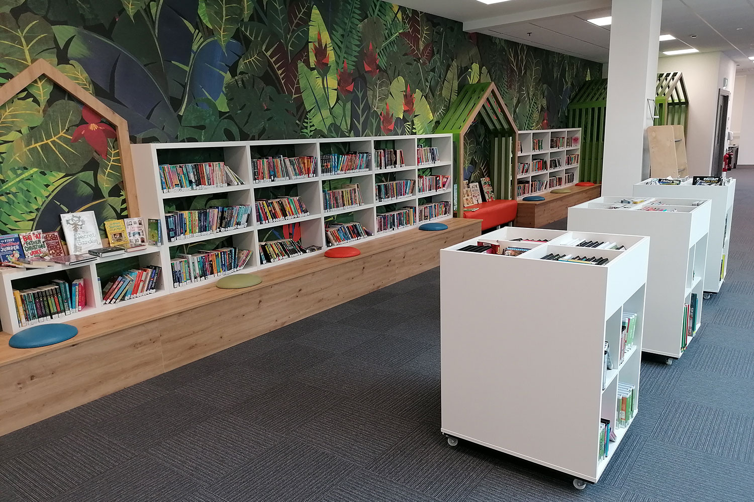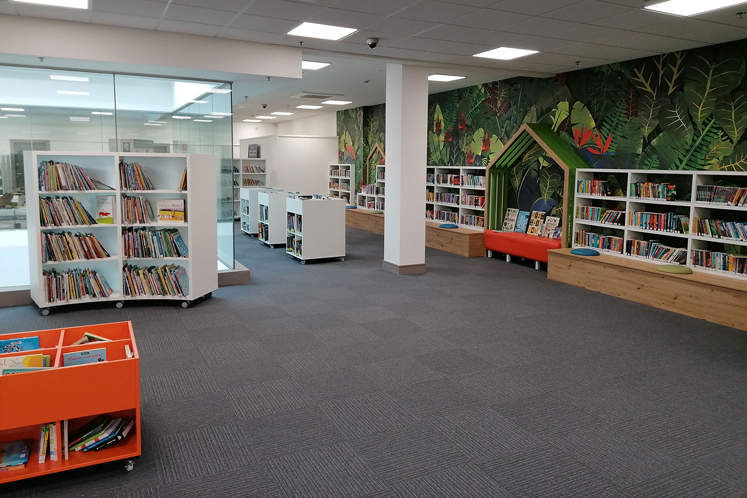 The open plan library, with a glazed panel overlooking the mall below, allowed us to use our creative flare. We installed brightly coloured wall graphics and created a house-like landscape which is striking to passers- by and busy shoppers.