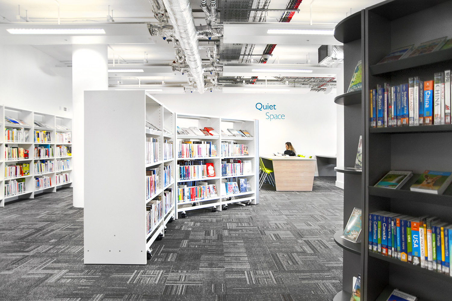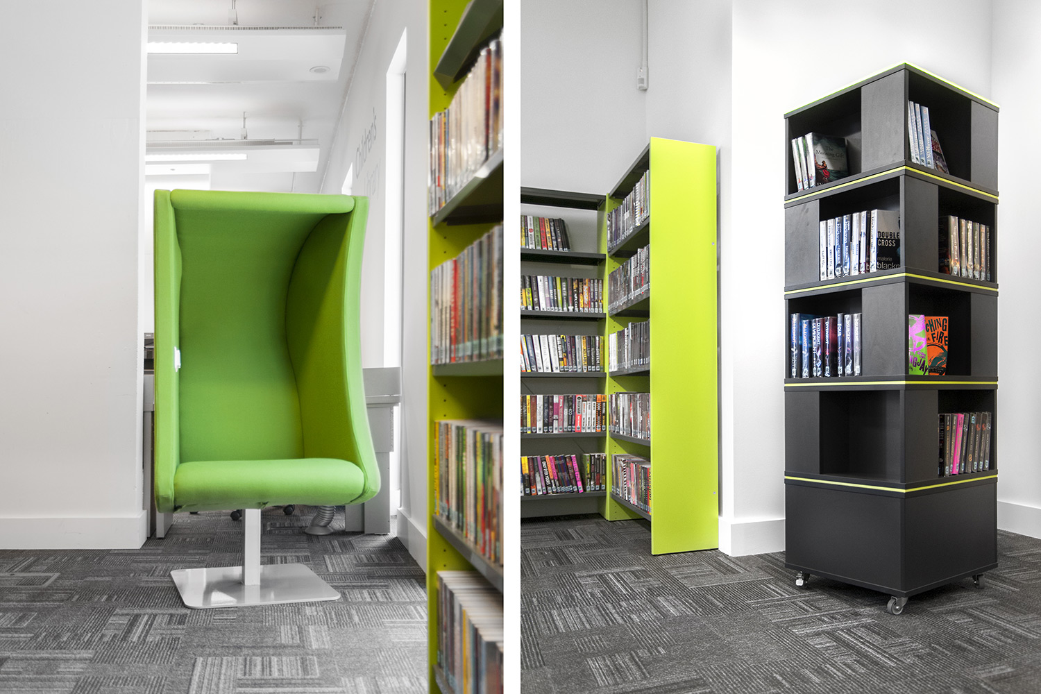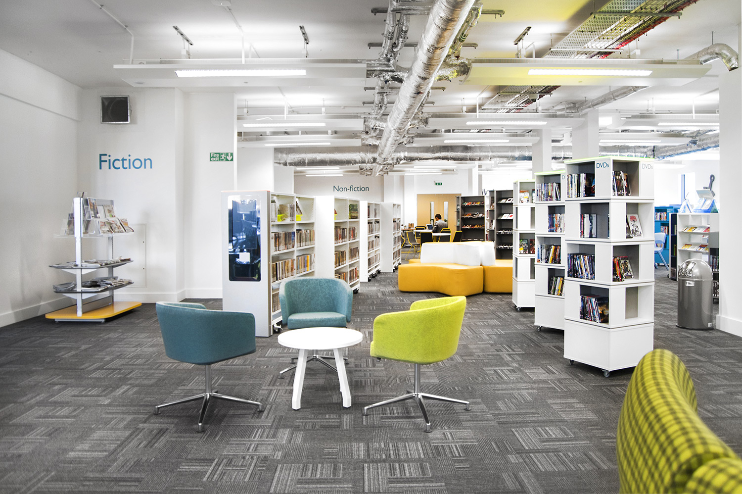 Throughout the library, digital end panels allow customers to browse for specific books and authors as well as giving access to the library’s app which highlights new books and facilities that are available for each customer.