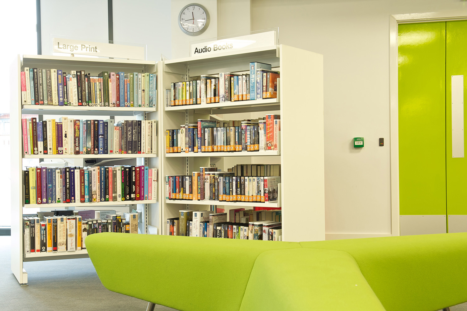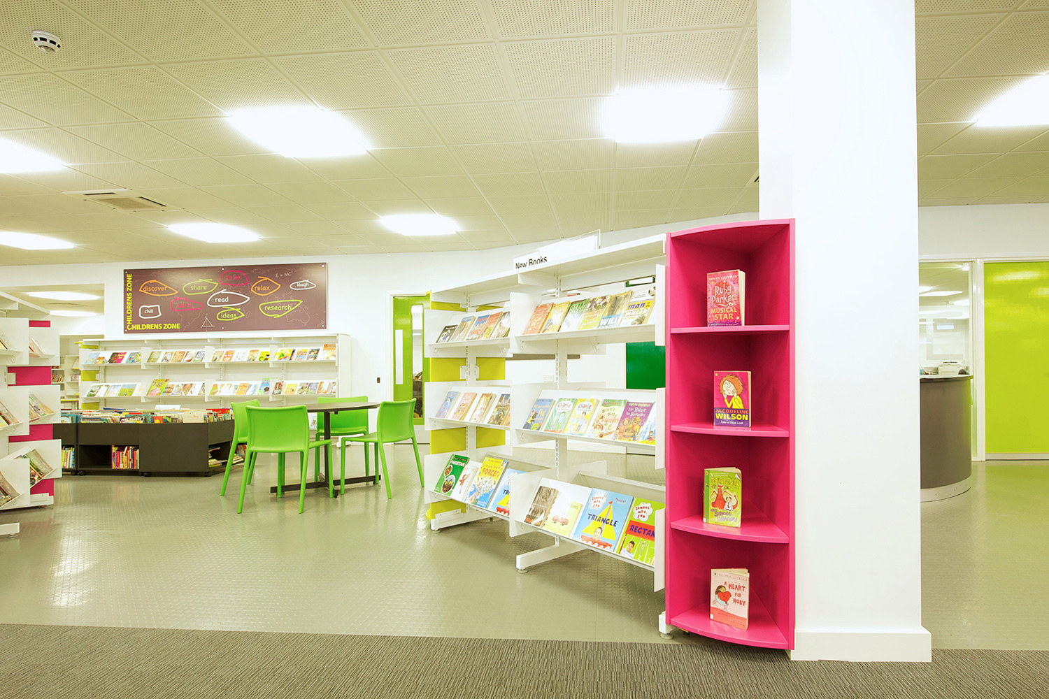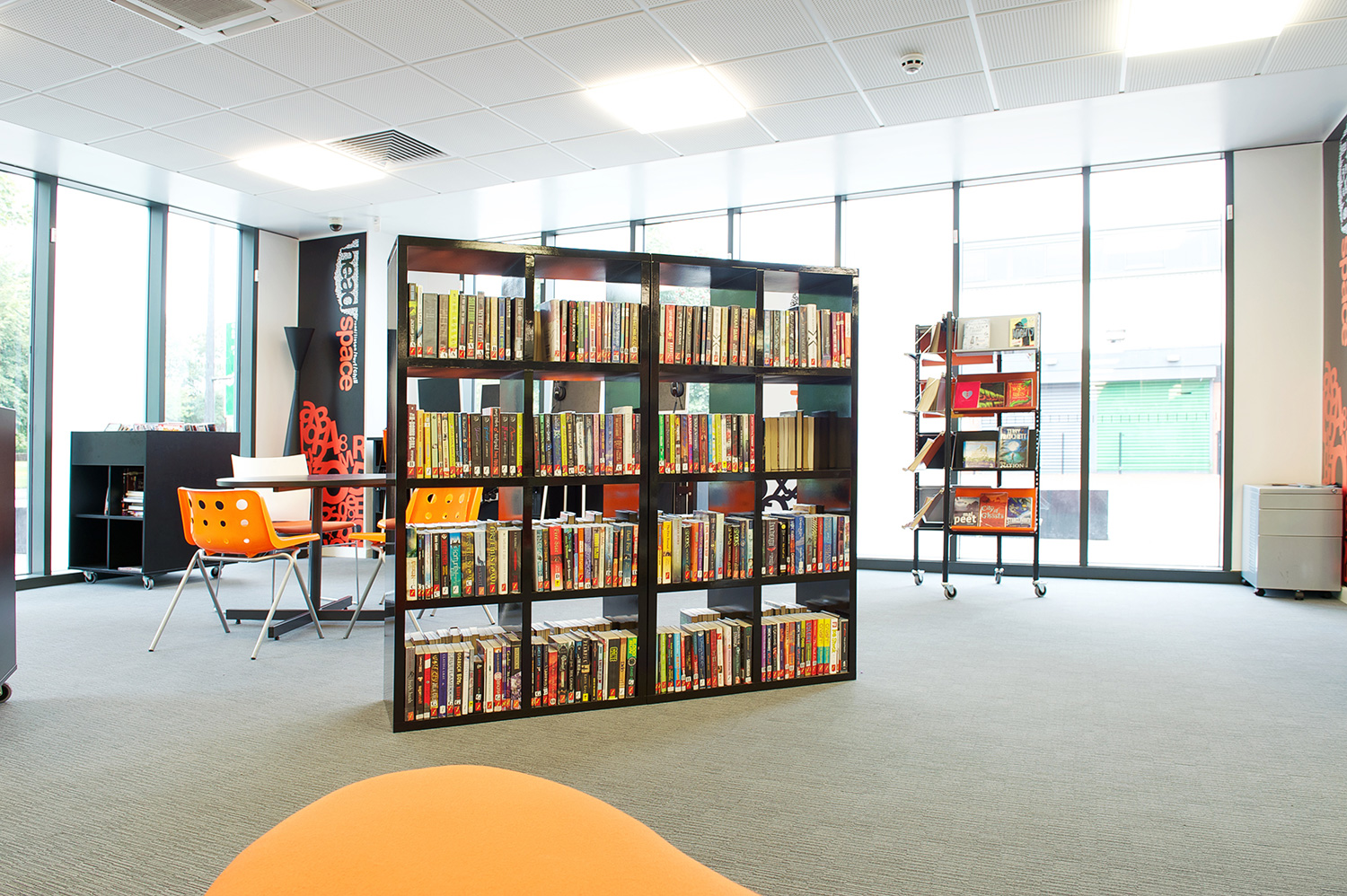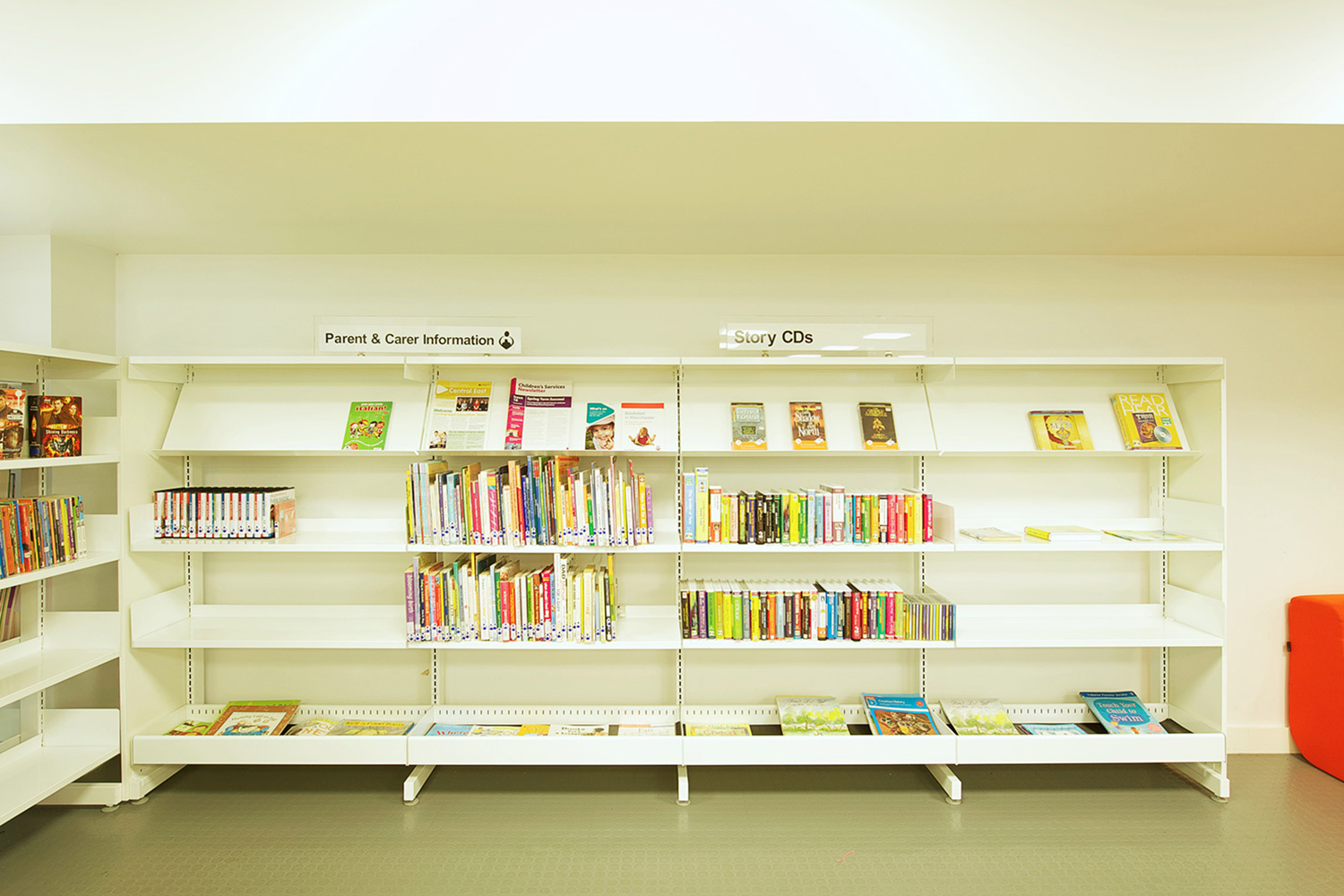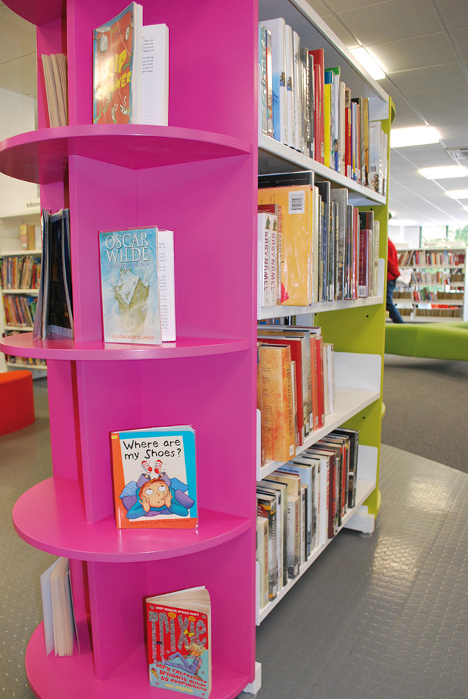 The library is equipped with Classic Steel Shelving System and specially made key pieces of furniture, designed to highlight the current quick pick furniture. The library share the same basic concept as Beswick, Brooklands and the Central Library in Manchester, but the unique colour themes and a couple of characteristics details give the library its own identity.