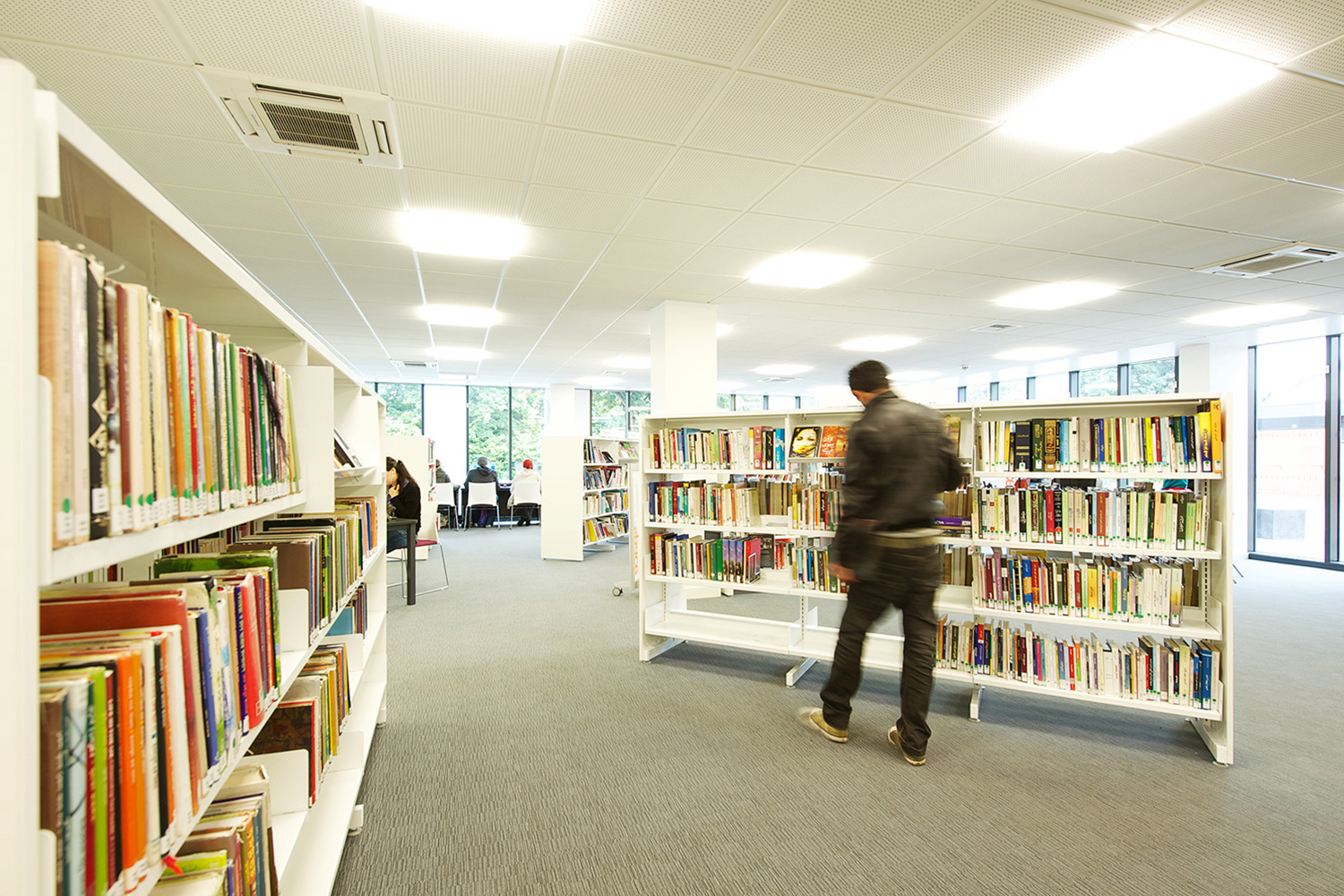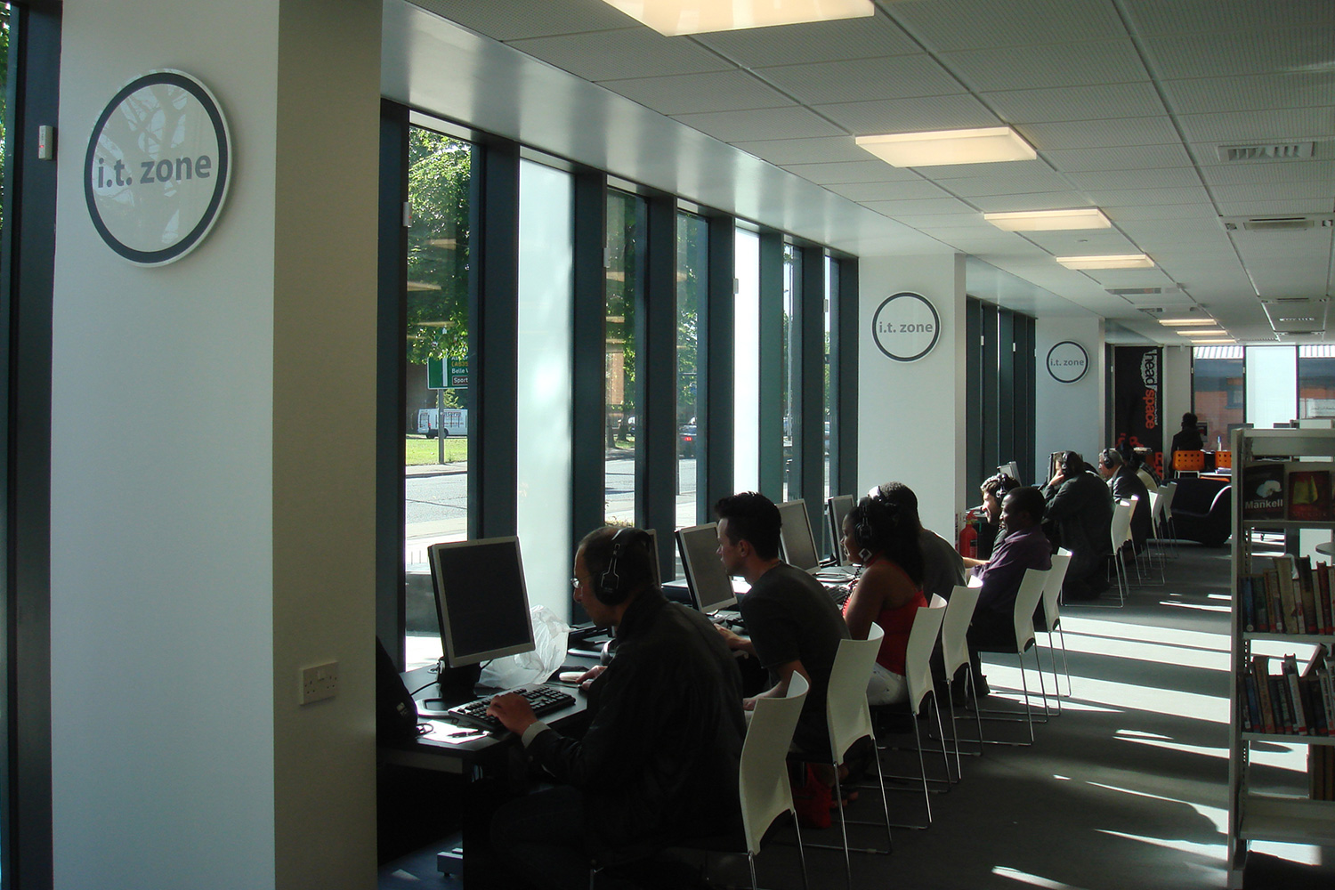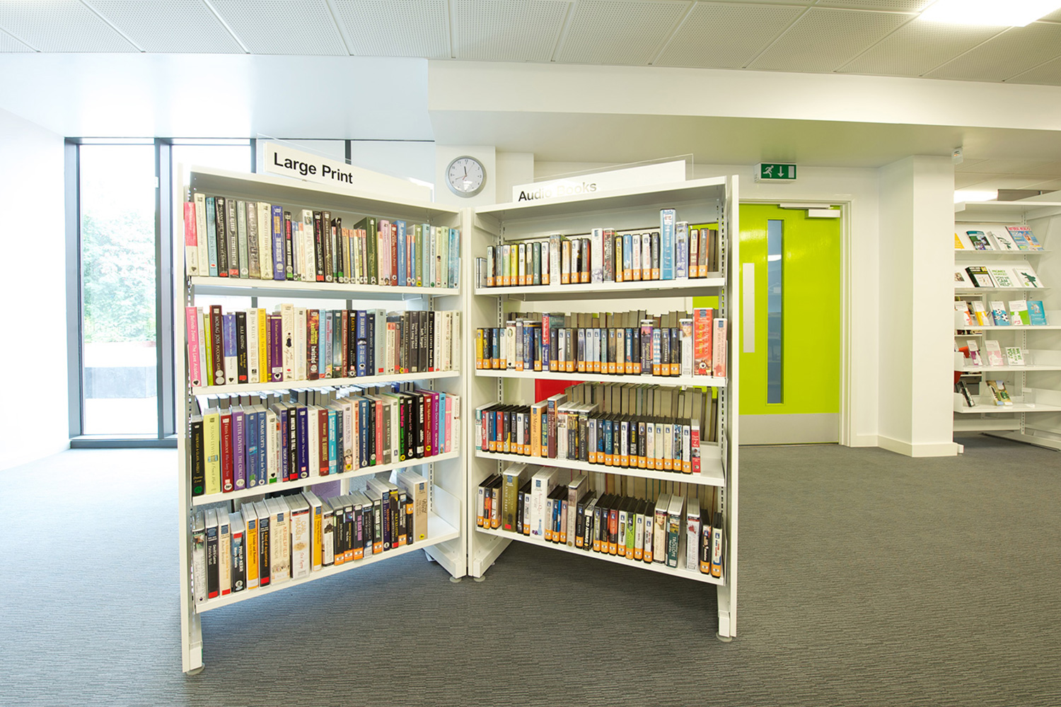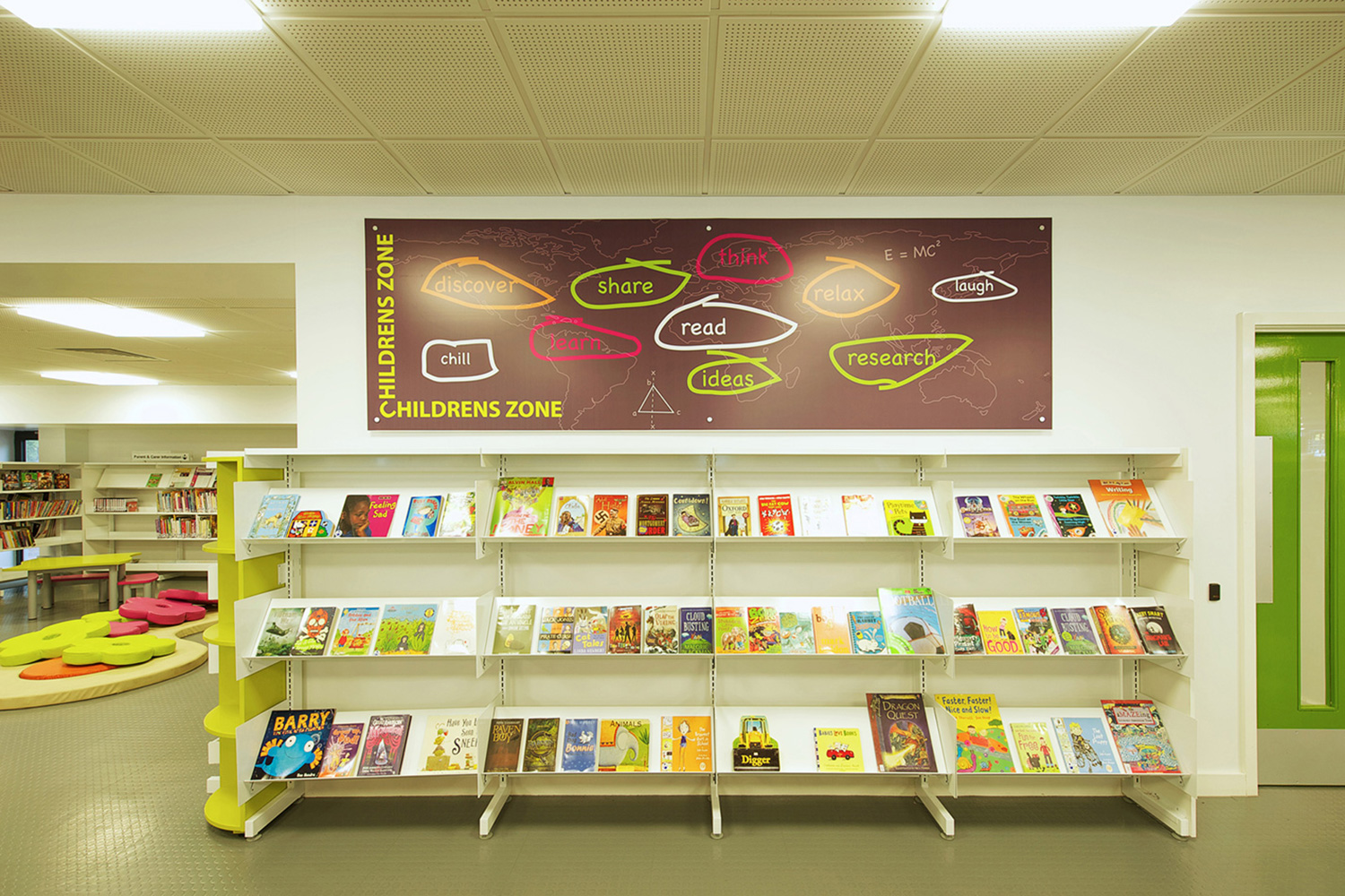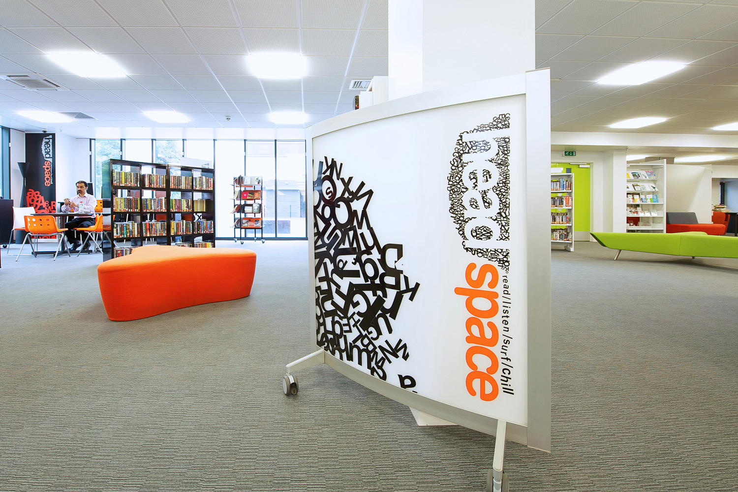 The library is equipped with Classic Steel Shelving System and specially made key pieces of furniture, designed to highlight the current quick pick furniture. The library share the same basic concept as Beswick, Brooklands and the Central Library in Manchester, but the unique colour themes and a couple of characteristics details give the library its own identity.