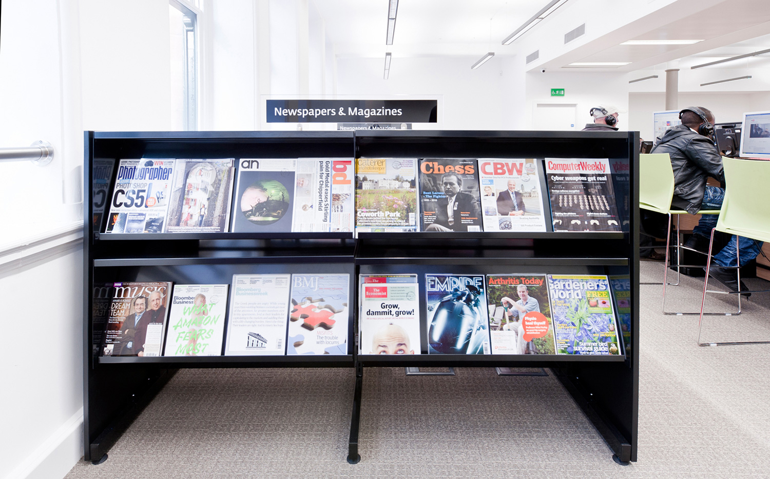 The library is equipped with Classic Steel Shelving System and specially made key pieces of furniture, designed to highlight the current quick pick furniture. The library share the same basic concept as Longsight, Beswick and Brookland, but the unique colour themes and a couple of characteristics details give the library its own identity.