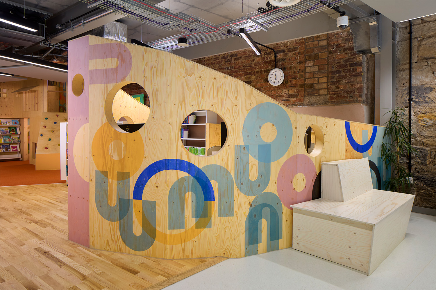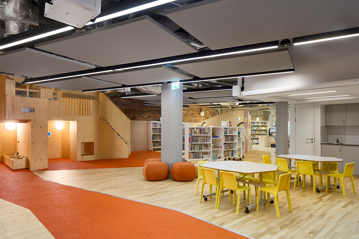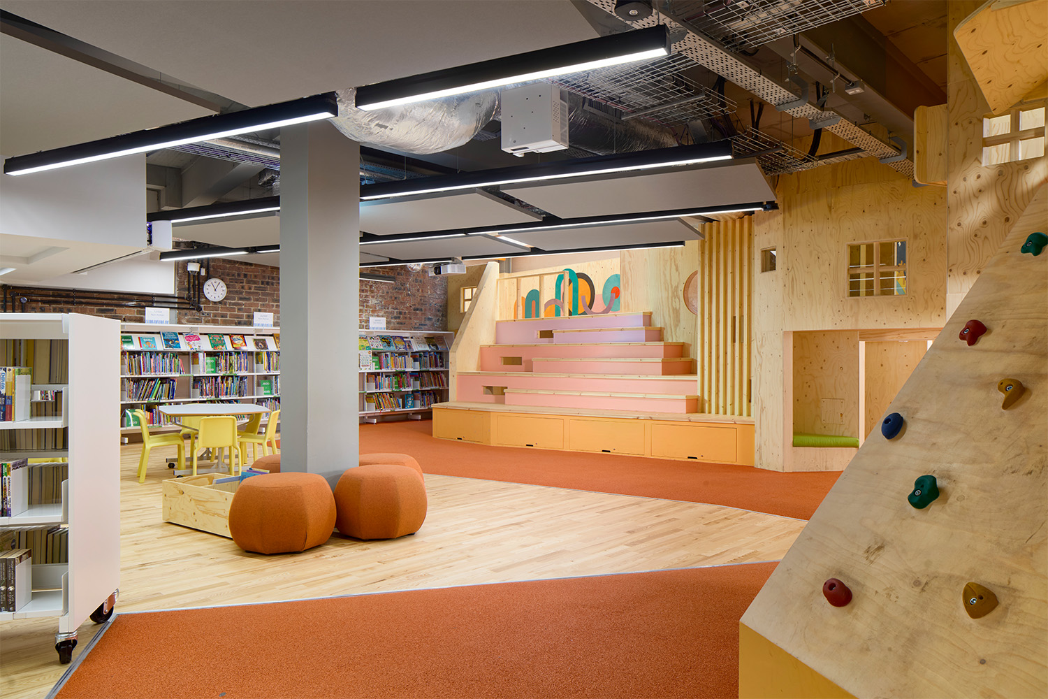 An urban foyer accessed from the High Street leads to secret rooms for children to play and explore within the children’s library and a storytelling area with play structure featuring designs by Scottish artist Claire Barclay. A living room on the 1st floor houses the main library collection and leads to events rooms for meetings and performances. The 2nd floor reading room provides a quiet environment and leads to the study room gallery and an outdoor room providing an external, elevated garden.