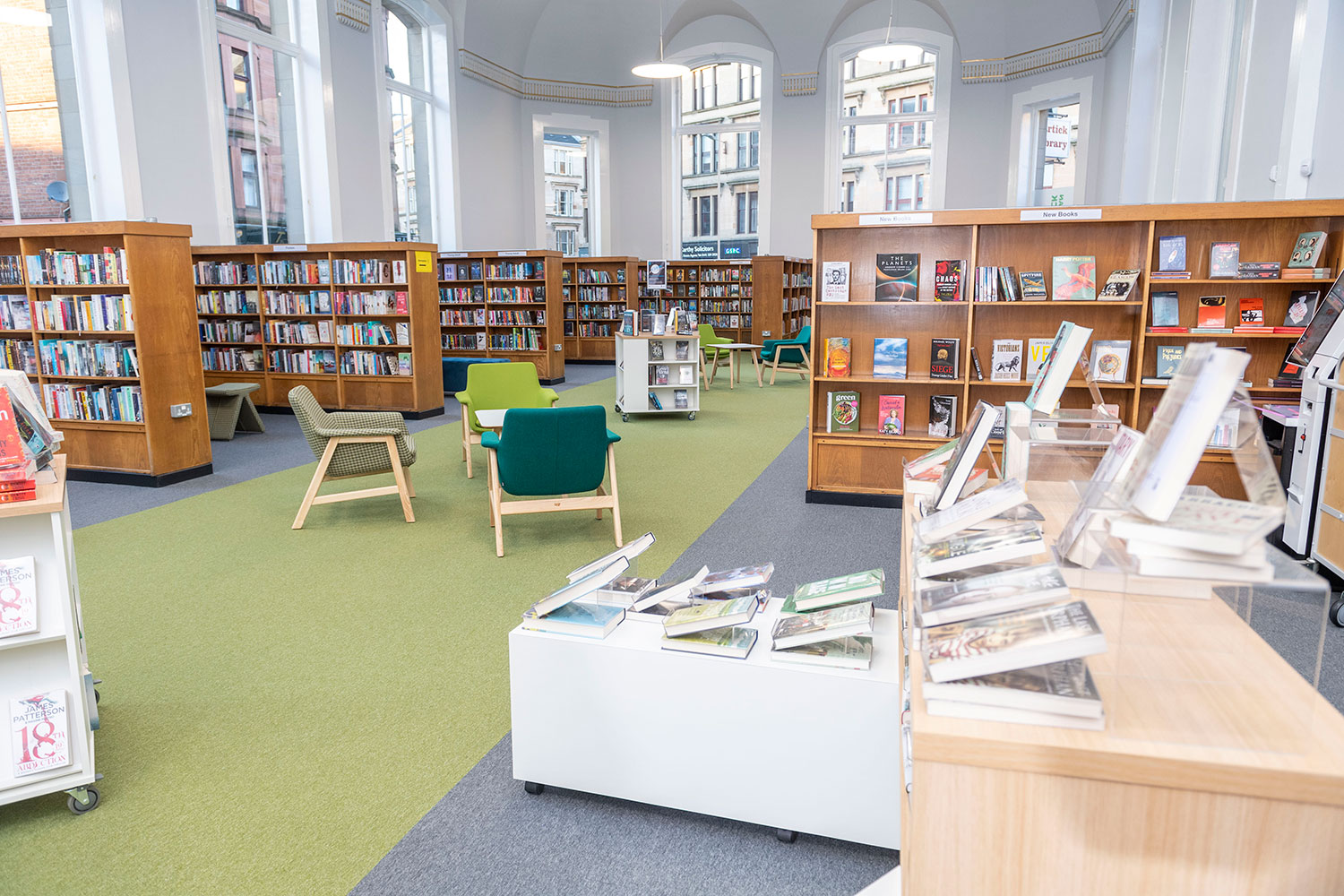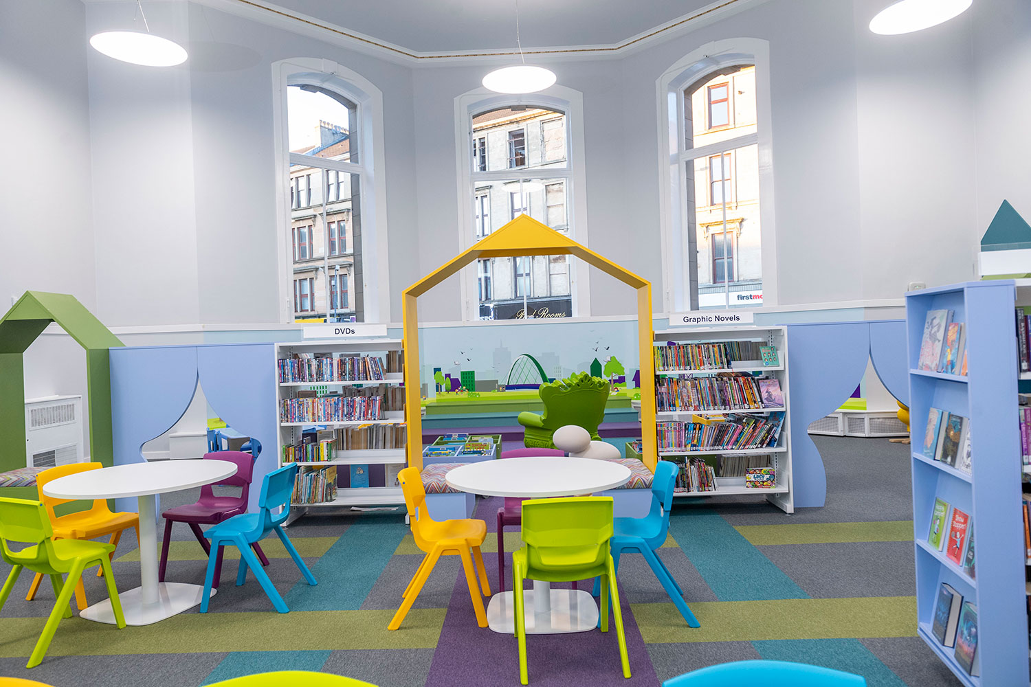 The Children’s Library has been completely revamped. Brightly coloured walls, shelving and furniture capture users attention and creates a space where youngsters want to spend time. A multi-platform stage can be used for events and a sensory nook, the first available in Glasgow, provides a safe space for children with additional needs.