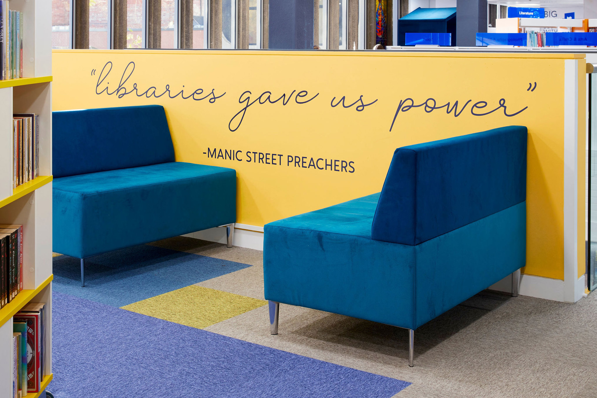 Special attention to detail was paid to the fabric selection and colours for all the soft furnishings. Thedesignconcept ltd. chose all the paint finishes throughout the library and these are complimented with the use of carefully selected digital graphics and inspirational quotes that lift the overall mood of the space; allowing for more positive and motivated users. We designed a carpet layout that also punches with random placement of colour that will work with any future layout of the space.